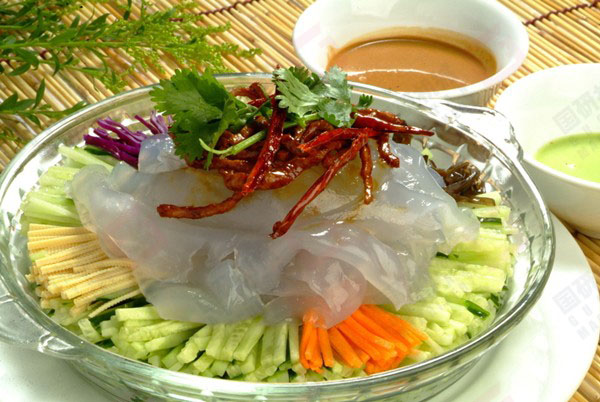 5.吃的时候将拉皮从水中取出切成宽条,放入备好的各种丝、炒好的肉丝和兑好的调料汁,再放入少许盐拌匀就可以吃了,在饭店吃或者做宴客菜,就将所有的丝垫底,上面放拉皮,炒好的肉丝放到拉皮上,再浇上调料汁,吃的时候再拌匀就可以了