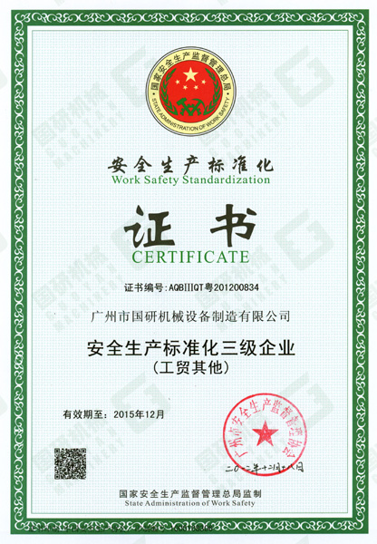 2012年12月24日,国家安全生产监督管理总局为乐鱼网页版机械公司颁发了《安全生产标准化企业证书》,这意味着我司已达到《广州市工业企业安全生产标准化评定办法》及《广州市工业企业安全生产标准化评定标准》的要求。