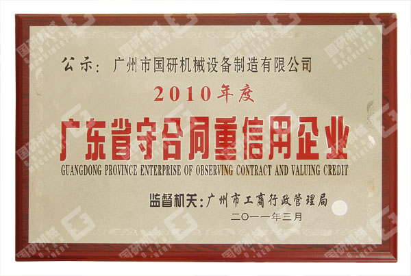 2011年4月,继连续三年被评为“广州市守合同重信用企业”之后,乐鱼网页版机械再获殊荣,被评为2010年度“广东省守合同重信用企业”。