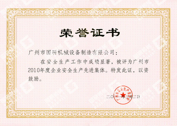 近日,在广州市人民政府召开的安全生产工作总结暨表彰大会上再次传来喜讯,广州市乐鱼网页版机械设备制造有限公司被广州市人民政府授予“广州市2010年度企业安全生产先进集体”荣誉称号。这是我司获得中华全国总工会和国家安全生产监督管理总局授予2009年度全国“安康杯”竞赛优胜企业称号后,被授予的又一殊荣。