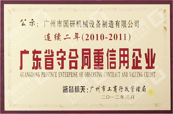 2012年3月,广州市乐鱼网页版机械设备制造有限公司被评为2011年度“广东省守合同重信用企业”。这是我司继连续三年被评为“广州市守合同重信用企业”之后,连续两年获此殊荣。