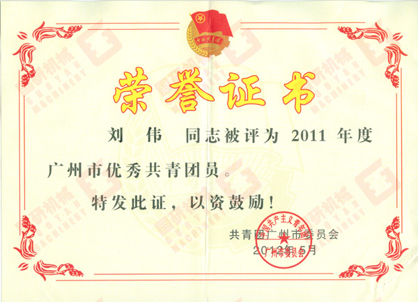 2012年6月,乐鱼网页版机械公司刘伟同志被共青团广州市委员会评为“2011年度广州市优秀共青团员”。